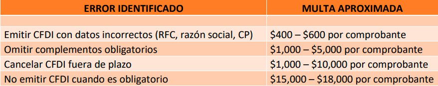 • Omisión de complementos obligatorios: Especialmente en comprobantes de nómina, pagos en parcialidades o comercio exterior.